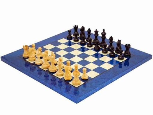 Ensemble Echiquier en Bois d’Erable Bleu Satiné & Jeu d’Echecs en Bois de Buis – Broadbase